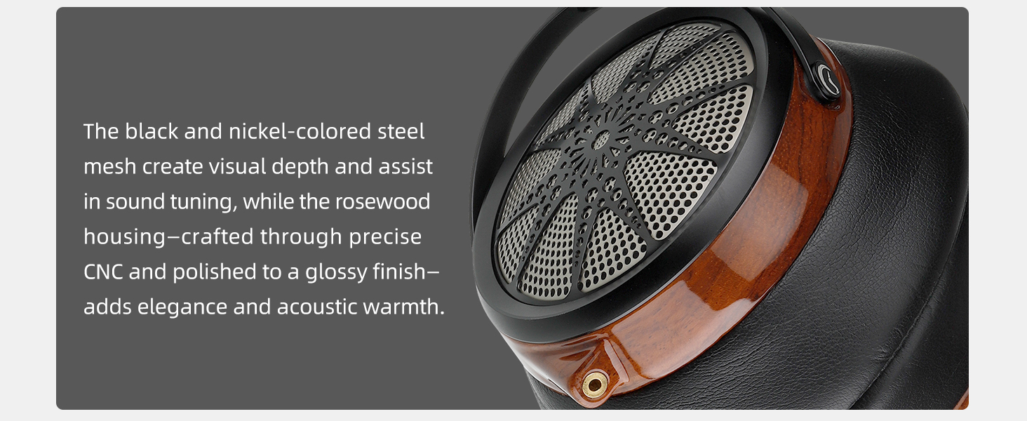 3. The earcup is made of rosewood with high gloss treatment on the surface. The sunlight decoration steel mesh makes the headphone design novel and unique.
